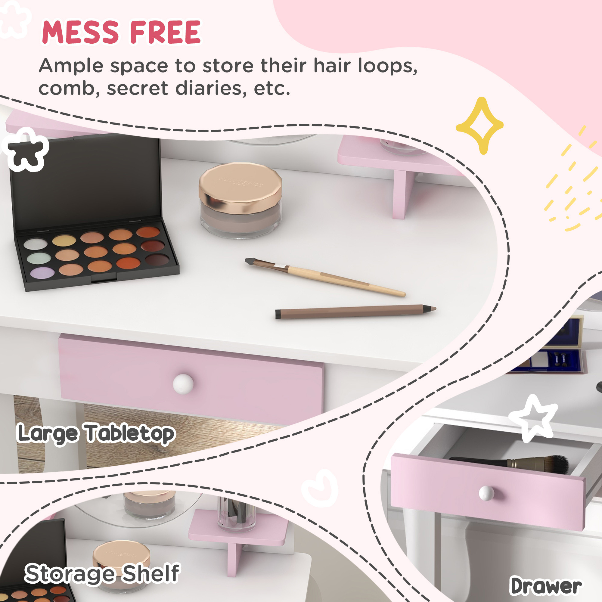 - Safe material: An MDF structure for strength and stability, this girls dressing table set and bed doesn't wobble or shake when in use. The mirrors are made from acrylic, so they won't break or shatter easily.