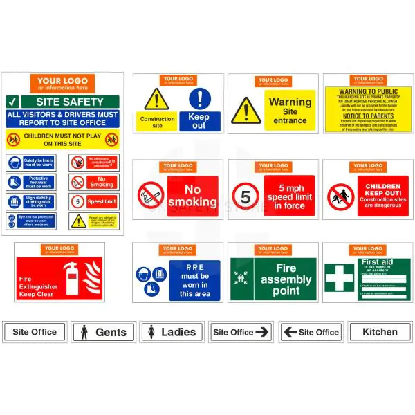A (medium sized) 20 Construction Site Sign Pack - containing relevant safety signs for a medium sized construction project. This pack offers better value than buying these signs separately and personalised with your company logo or branding for a professional brand experience across your site. Manufactured by us here in the UK and delivered in just a few days.