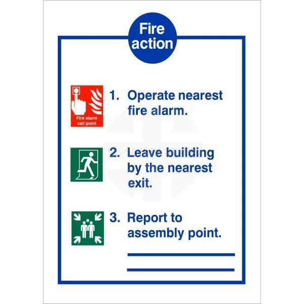 - This sign clearly displays the actions which are required in the event a fire breaks out on the premises