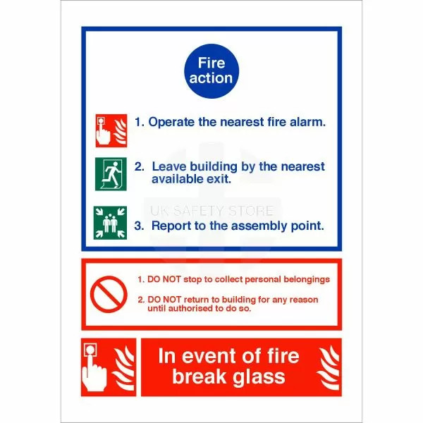 3 Point Fire Action Notice Sign - In Event Of Fire Break Glass