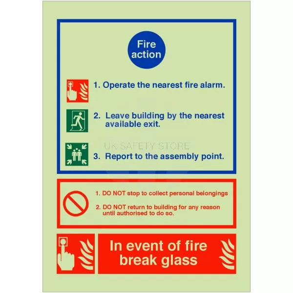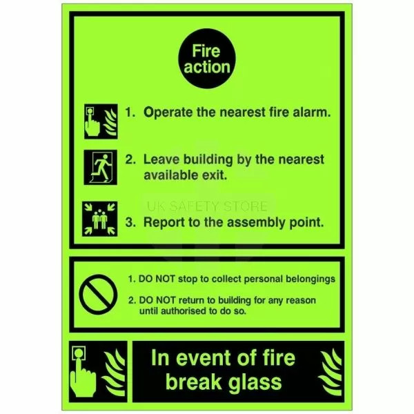 3 Point Glow In The Dark Fire Action Notice Sign - In The Event Of Fire Break Glass