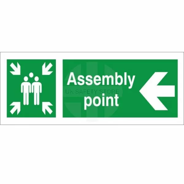 - This sign clearly shows the assembly point with a highly visible arrow left symbol in white colour against the green background.