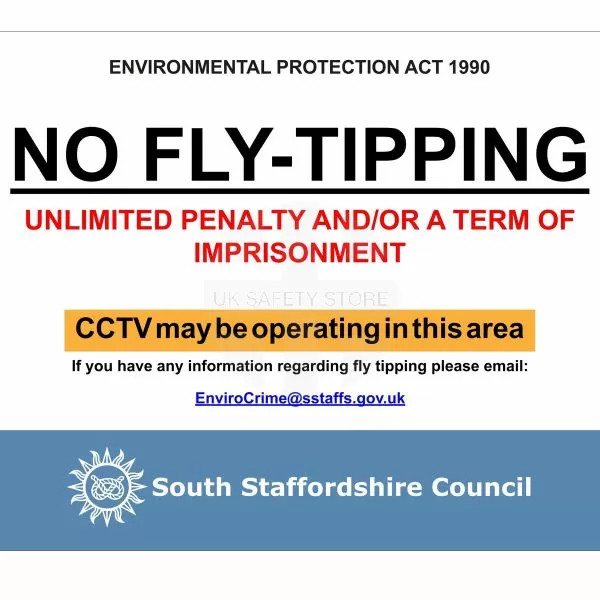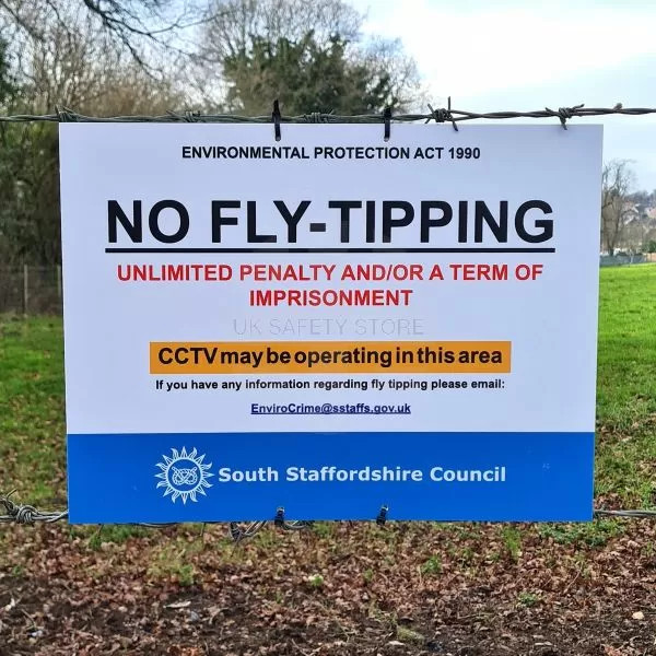 - Custom Printed No Fly-Tipping signs, including your own text, layout, CCTV, Warning, Prohibition symbols, logos.