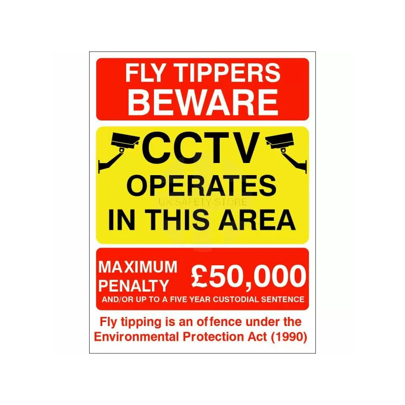 - Strong clear wording stating: "Fly Tippers Beware - CCTV Operates In This Area" sign, and includes a section: "Maximum Penalty £50,000" section.