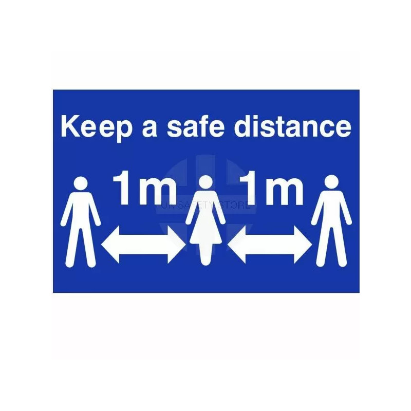 - There are icons of 3 people on the sign with white arrows in-between them representing 1metre social distancing
