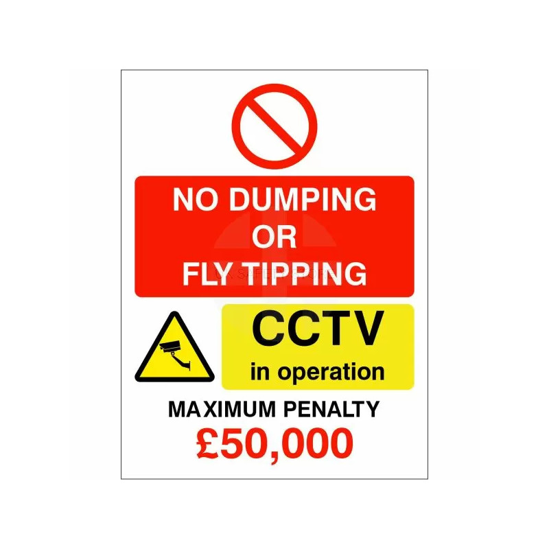 - Strong clear wording stating: "No Dumping or Fly Tipping CCTV In Operation" sign, and includes a section: "Maximum Penalty £50,000" sentence.