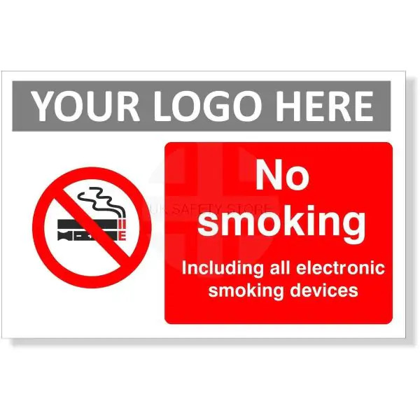 - This constuction site sign has white text on a red background and reads "No smoking Including all electronic smoking devices"