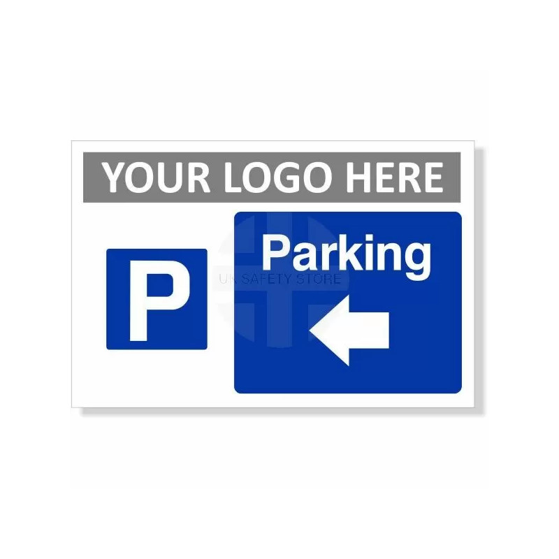 - This constuction parking sign has white text on a blue background and reads "Parking"