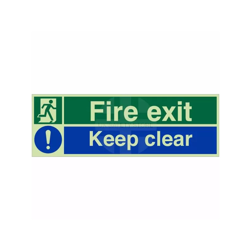 Glow in the dark Fire Exit Keep Clear multi-message Sign with "running man" and "exclamation mark" symbols. It is a legal requirement that fire exits be kept clear at all times to provide a safe route of passage during an emergency. Due to the glow in the dark nature of this sign it can be read in total darkness or low-light or smoke filled environments.
