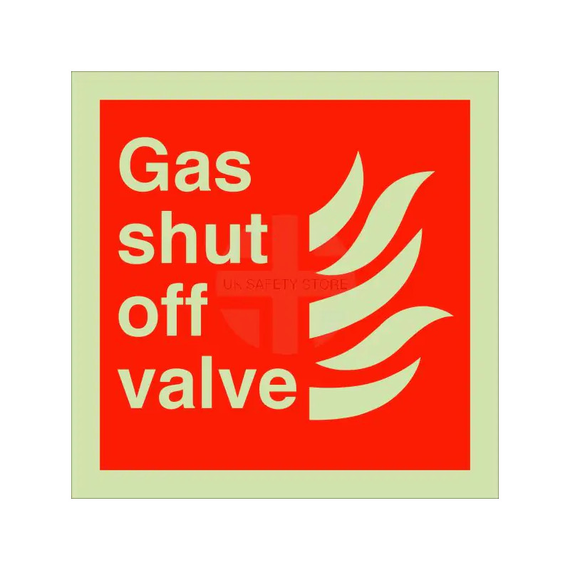 - Glow in Dark Gas Shut Off Valve text with fire flame symbol on red background