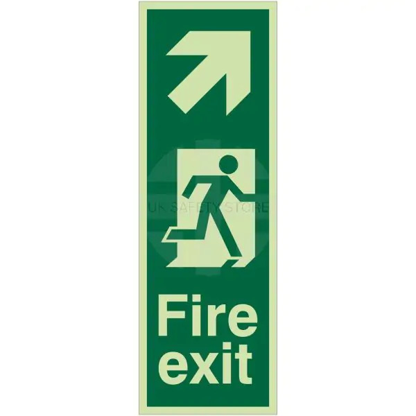 Vertical design of Glow in the Dark Fire Exit Arrow Up Right Sign with "running man" and "up/right arrow" symbols. Glow in the dark signage can be read in total darkness or low-light and smoke filled environments.