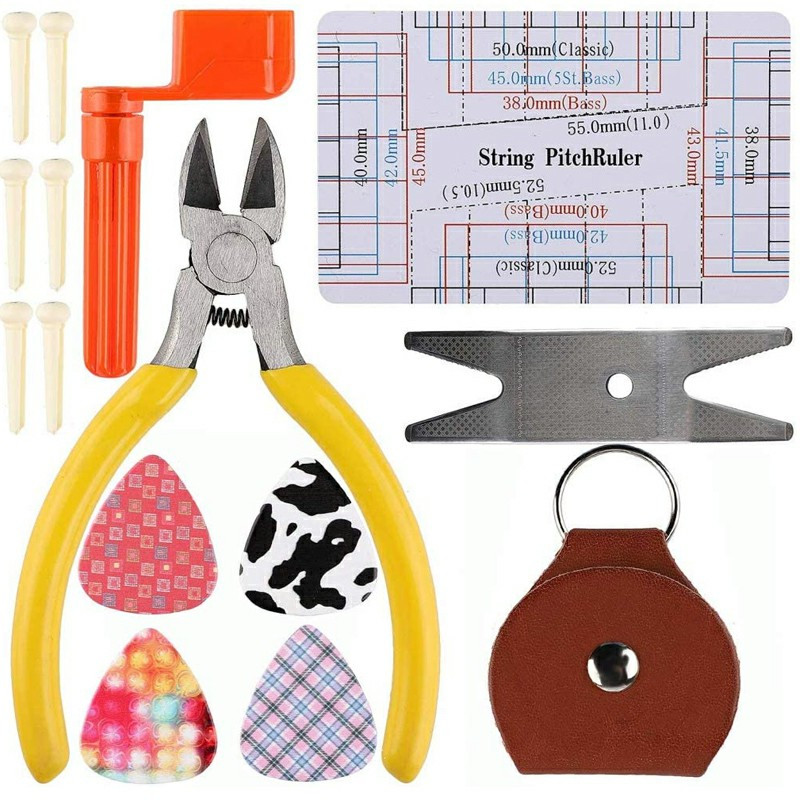 - Guitar repairing tool kit(26PCS) is including wire plier, string organizer, fingerboard protector, hex wrenches, files, string ruler action ruler, spanner wrench, bridge pins for guitar ukulele bass mandolin.