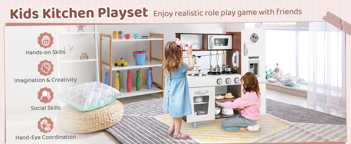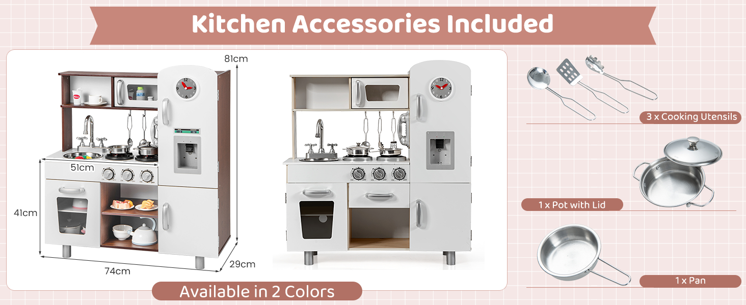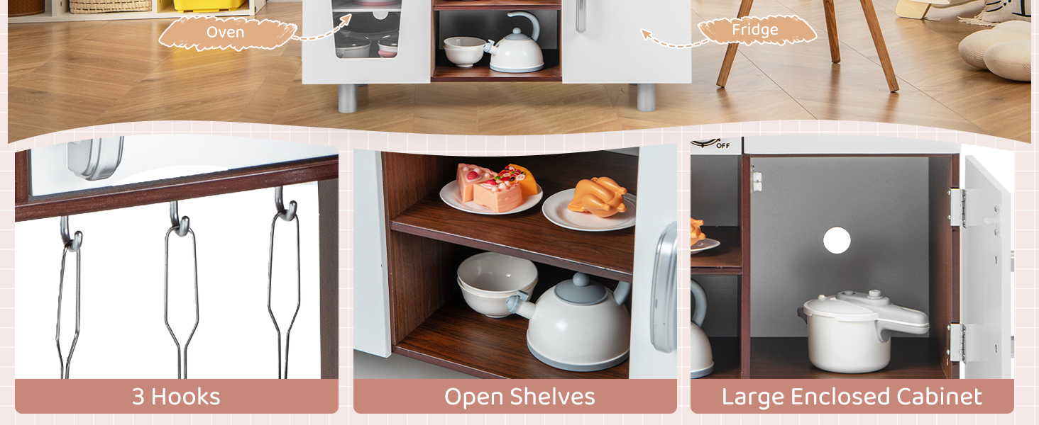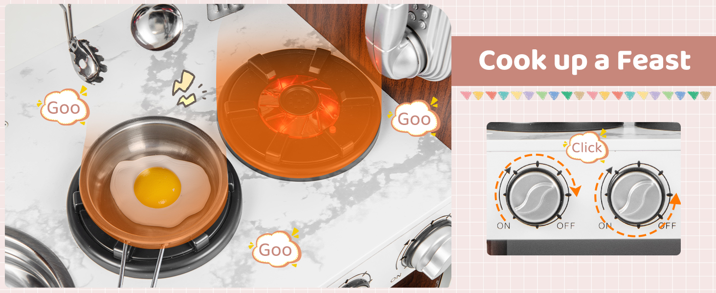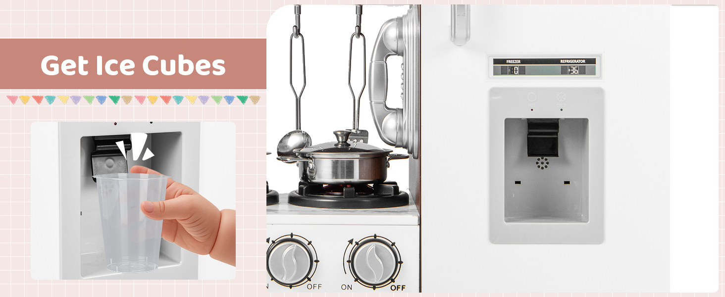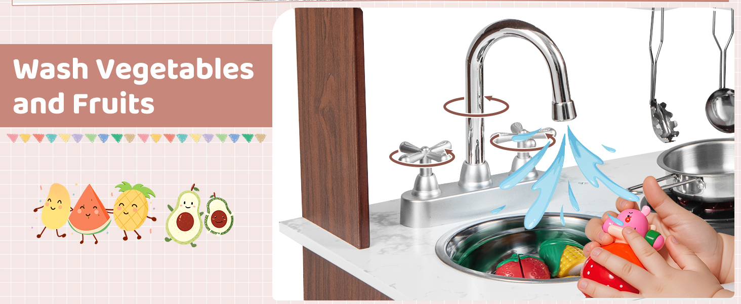 Realistic Sound and Light Effects: The wooden kids kitchen has dual stoves and a water dispenser, both of which boast realistic sounds and light to engage toddlers. Likewise, when children rotate the knobs, they will make "click" sounds for enhanced fun.