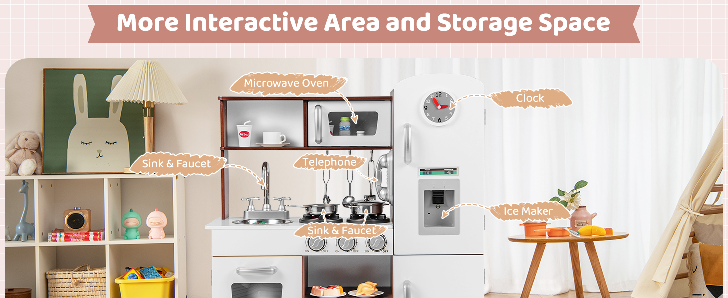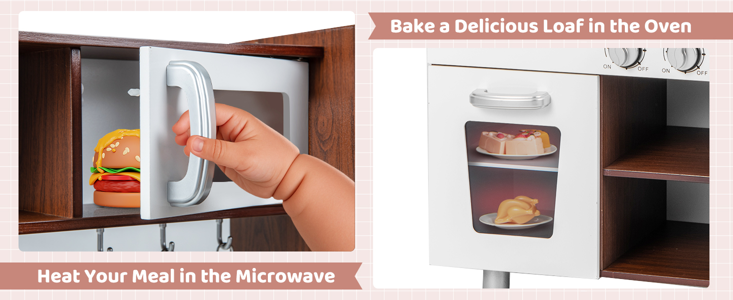 Immersive Role-play Experience: With a clock and telephone, kids can pretend to call friends for a meal when time is up. Besides, this pretend play kitchen also features a microwave, sink and oven that give toddlers a more complete cooking experience.